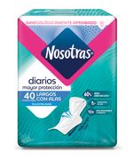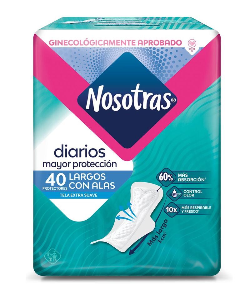 Protectores Diarios Nosotras® Largos con Alas x 40 unidades. Protectores con máxima protección, amigables con tu piel. Estos protectores diarios se encargan hasta de los flujos más inesperados y evitan malos olores, para que siempre te sientas fresca y segura.